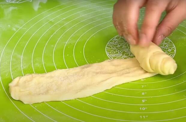 Раскатываем колобки в небольшие прямоугольные пластинки, соединяем концы двух пластинок между собой. Сворачиваем пластинки в рулет и делим надвое.
