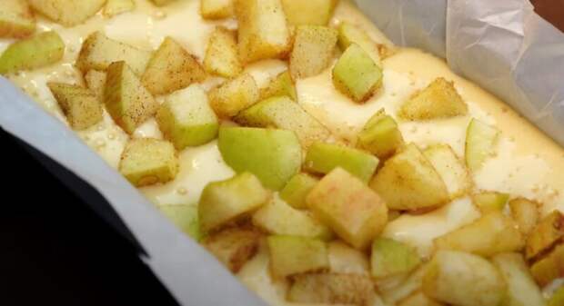 Нарезаем небольшими кубиками яблоки, посыпаем парой ложек коричневого сахара и по желанию добавляем корицу. Выкладываем яблоки на верхушку теста и выпекаем пирог при 180 градусах 40 минут.