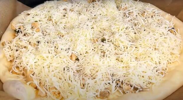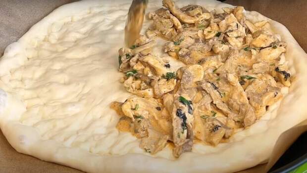 Приготовление пиццы с курицей и грибами в сливочно-чесночном соусе: