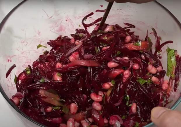Именно свёкла придаёт салату характерный бордово-рубиновый оттенок и естественную сочность.Дополняют свёклу отварная или консервированная фасоль, которая придает блюду сытность и белковую насыщенность.